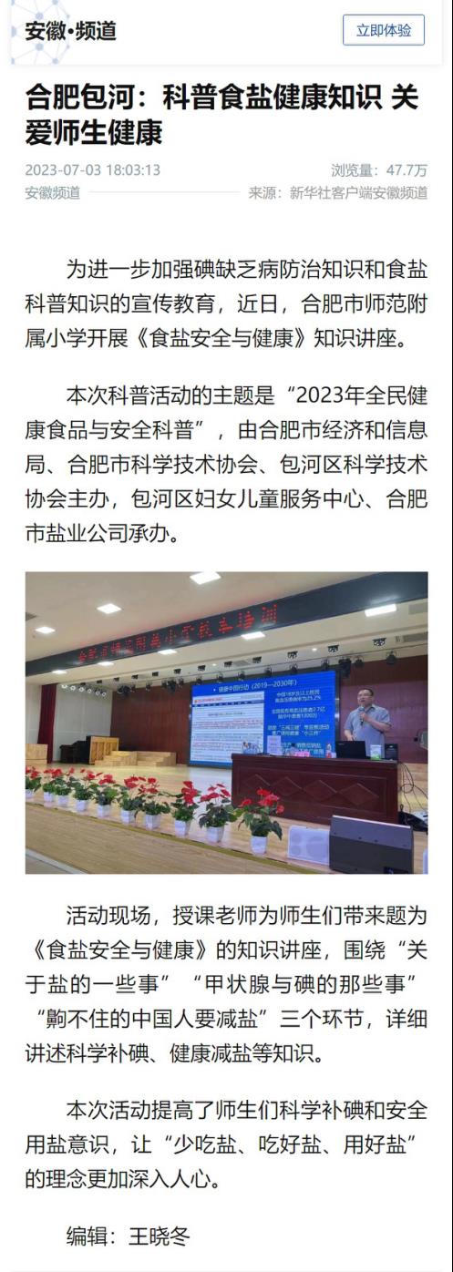 為切實做好黨的二十大精神宣傳貫徹工作,在習近平新時代中國特色社會主義思想指引下 ,進一步樹牢以人民健康為中心的發(fā)展思想,合肥鹽業(yè)在合肥市師范附屬小學開展食鹽科普活動,為全校200余名師生普及科學補碘、健康減鹽知識,關愛師生健康,推廣中鹽低鈉鹽,助力健康中國建設,食鹽健康科普活動得到新華社客戶端安徽頻道關注報道,截至發(fā)稿日總瀏覽量達47.7萬次。